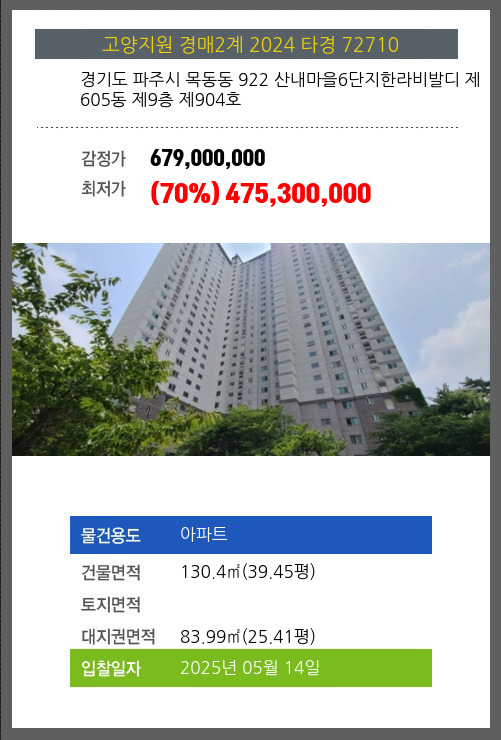 사건번호 2024 타경 72710 본건은 경기도 파주시 목동동 922 산내마을6단지한라비발디 제605동 제9층 제904호소재하는 아파트경매 물건의 포스팅입니다. 건물면적 [ 130.4㎡ (39.45평) ]대지권 [ 83.99㎡ (25.41평) ]