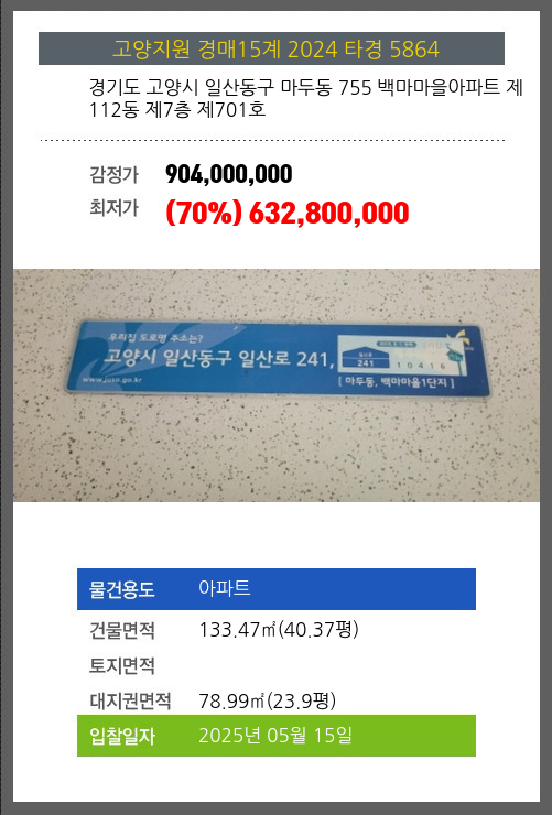 사건번호 2024 타경 5864 본건은 경기도 고양시 일산동구 마두동 755 백마마을아파트 제112동 제7층 제701호소재하는 아파트경매 물건의 포스팅입니다. 건물면적 [ 133.47㎡ (40.37평) ]대지권 [ 78.99㎡ (23.9평)
