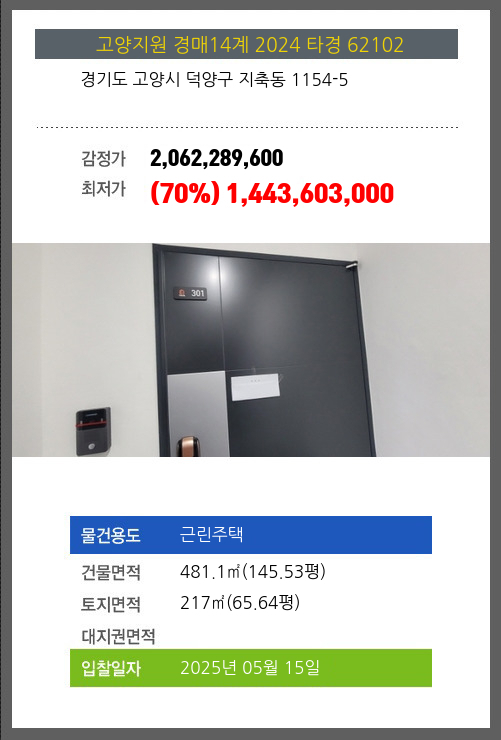 사건번호 2024 타경 62102 본건은 경기도 고양시 덕양구 지축동 1154-5소재하는 근린주택경매 물건의 포스팅입니다. 건물면적 [ 481.1㎡ (145.53평) ]토지면적 [ 217㎡ (65.64평) ] 시세를 반영한 감정가