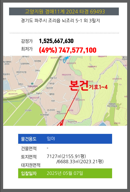 사건번호 2024 타경 69493 본건은 경기도 파주시 조리읍 뇌조리 5-1 외 3필지소재하는 임야경매 물건의 포스팅입니다. 토지면적 [ 전체:7127㎡ (2155.91평) 매각지분:6688.33㎡ (2023.21평) ] 시세를 반영한 감정가