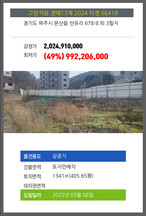 사건번호 2024 타경 66418 본건은 경기도 파주시 문산읍 선유리 678-8 외 3필지소재하는 잡종지경매 물건의 포스팅입니다. 건물면적 [ 토지만매각 ]토지면적 [ 1341㎡ (405.65평) ] 시세를 반영한