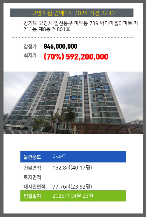사건번호 2024 타경 2230 본건은 경기도 고양시 일산동구 마두동 739 백마마을아파트 제211동 제8층 제801호소재하는 아파트경매 물건의 포스팅입니다. 건물면적 [ 132.8㎡ (40.17평) ]대지권 [ 77.76㎡ (23.52평)