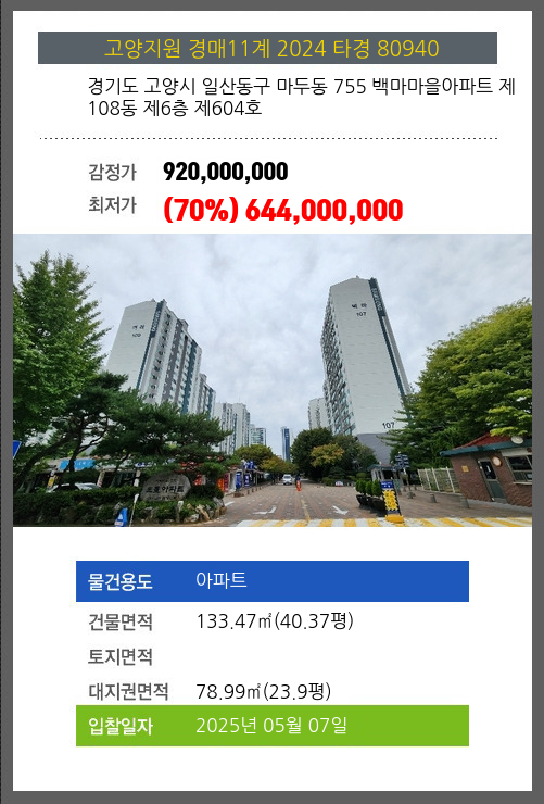 사건번호 2024 타경 80940 본건은 경기도 고양시 일산동구 마두동 755 백마마을아파트 제108동 제6층 제604호소재하는 아파트경매 물건의 포스팅입니다. 건물면적 [ 133.47㎡ (40.37평) ]대지권 [ 78.99㎡ (23.9평)