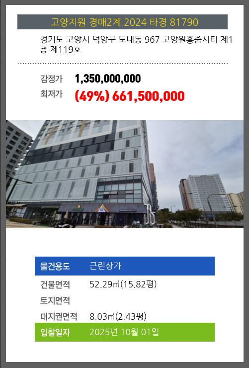 사건번호 2024 타경 81790 본건은 경기도 고양시 덕양구 도내동 967 고양원흥줌시티 제1층 제119호소재하는 근린상가경매 물건의 포스팅입니다. 건물면적 [ 52.29㎡ (15.82평) ]대지권 [ 8.03㎡ (2.43평) ]