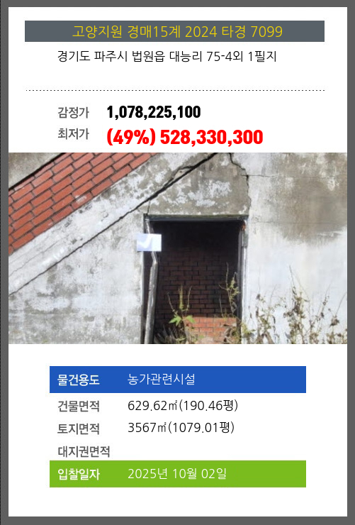 사건번호 2024 타경 7099 본건은 경기도 파주시 법원읍 대능리 75-4외 1필지소재하는 농가관련시설경매 물건의 포스팅입니다. 건물면적 [ 629.62㎡ (190.46평) ]토지면적 [ 3567㎡ (1079.01평) ] 시세를 반영한