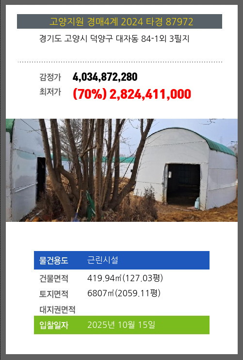 사건번호 2024 타경 87972 본건은 경기도 고양시 덕양구 대자동 84-1외 3필지소재하는 근린시설경매 물건의 포스팅입니다. 건물면적 [ 419.94㎡ (127.03평) ]토지면적 [ 6807㎡ (2059.11평) ] 시세를 반영한