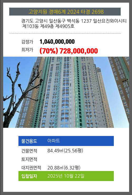 사건번호 2024 타경 2698 본건은 경기도 고양시 일산동구 백석동 1237 일산요진와이시티 제103동 제49층 제4905호소재하는 아파트경매 물건의 포스팅입니다. 건물면적 [ 84.49㎡ (25.56평) ]대지권 [ 20.88㎡ (6.32평)