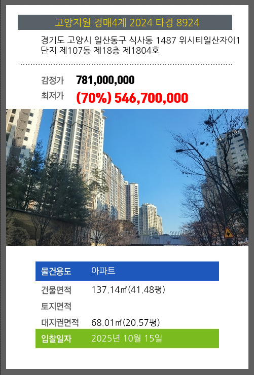사건번호 2024 타경 8924 본건은 경기도 고양시 일산동구 식사동 1487 위시티일산자이1단지 제107동 제18층 제1804호소재하는 아파트경매 물건의 포스팅입니다. 건물면적 [ 137.14㎡ (41.48평) ]대지권 [ 68.01㎡ (20.57평)