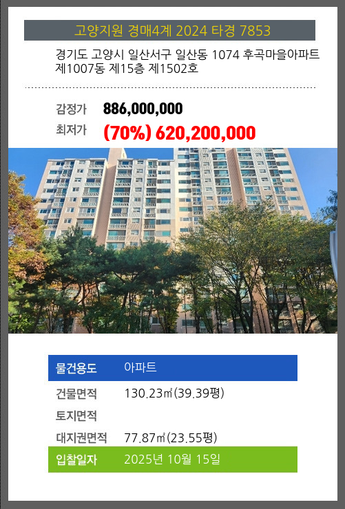 사건번호 2024 타경 7853 본건은 경기도 고양시 일산서구 일산동 1074 후곡마을아파트 제1007동 제15층 제1502호소재하는 아파트경매 물건의 포스팅입니다. 건물면적 [ 130.23㎡ (39.39평) ]대지권 [ 77.87㎡ (23.55평)