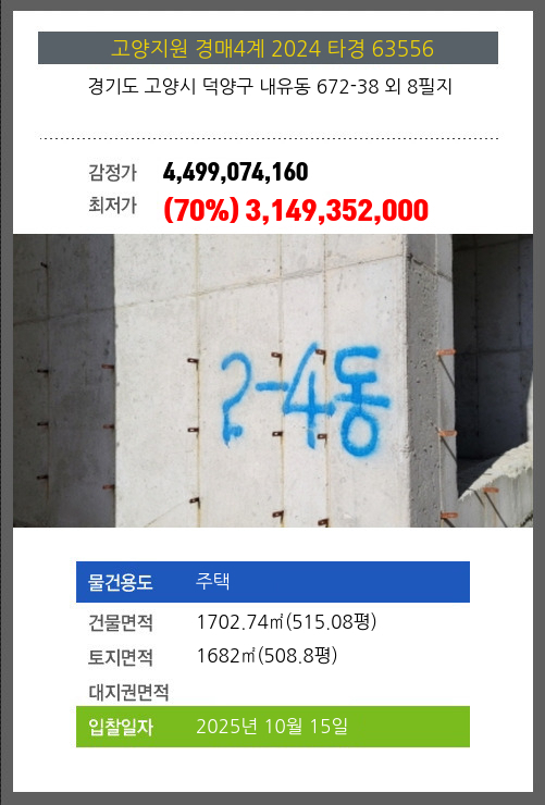 사건번호 2024 타경 63556 본건은 경기도 고양시 덕양구 내유동 672-38 외 8필지소재하는 주택경매 물건의 포스팅입니다. 건물면적 [ 1702.74㎡ (515.08평) ]토지면적 [ 1682㎡ (508.8평) ] 시세를