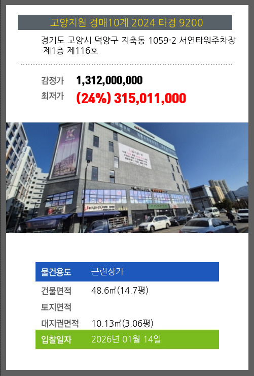 사건번호 2024 타경 9200 본건은 경기도 고양시 덕양구 지축동 1059-2 서연타워주차장 제1층 제116호소재하는 근린상가경매 물건의 포스팅입니다. 건물면적 [ 48.6㎡ (14.7평) ]대지권 [ 10.13㎡ (3.06평) ]