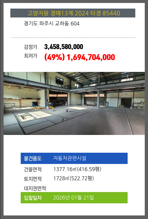 사건번호 2024 타경 85440 본건은 경기도 파주시 교하동 604소재하는 자동차관련시설경매 물건의 포스팅입니다. 건물면적 [ 1377.16㎡ (416.59평) ]토지면적 [ 1728㎡ (522.72평) ] 시세를 반영한 감정가 3,458,580,000에서2회