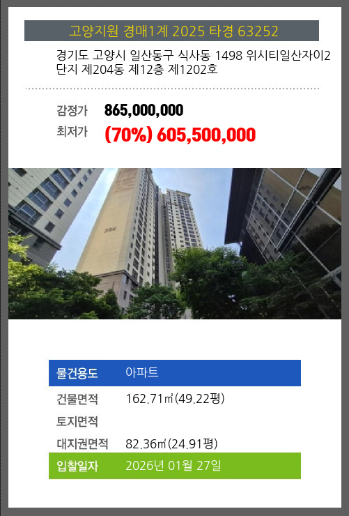 사건번호 2025 타경 63252 본건은 경기도 고양시 일산동구 식사동 1498 위시티일산자이2단지 제204동 제12층 제1202호소재하는 아파트경매 물건의 포스팅입니다. 건물면적 [ 162.71㎡ (49.22평) ]대지권 [ 82.36㎡ (24.91평)