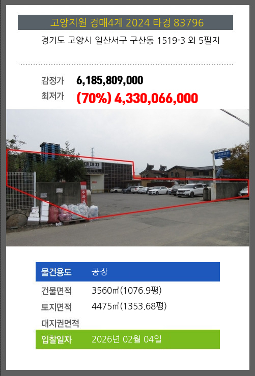 사건번호 2024 타경 83796 본건은 경기도 고양시 일산서구 구산동 1519-3 외 5필지소재하는 공장경매 물건의 포스팅입니다. 건물면적 [ 3560㎡ (1076.9평) ]토지면적 [ 4475㎡ (1353.68평) ] 시세를