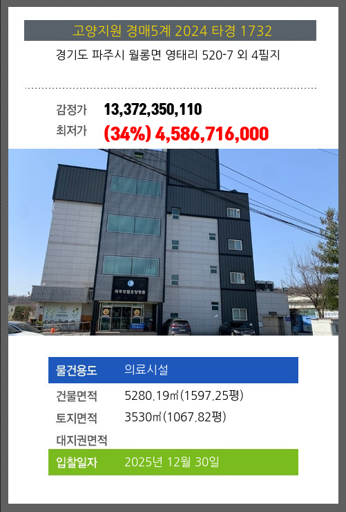 사건번호 2024 타경 1732 본건은 경기도 파주시 월롱면 영태리 520-7 외 4필지소재하는 의료시설경매 물건의 포스팅입니다. 건물면적 [ 5280.19㎡ (1597.25평) ]토지면적 [ 3530㎡ (1067.82평) ] 시세를