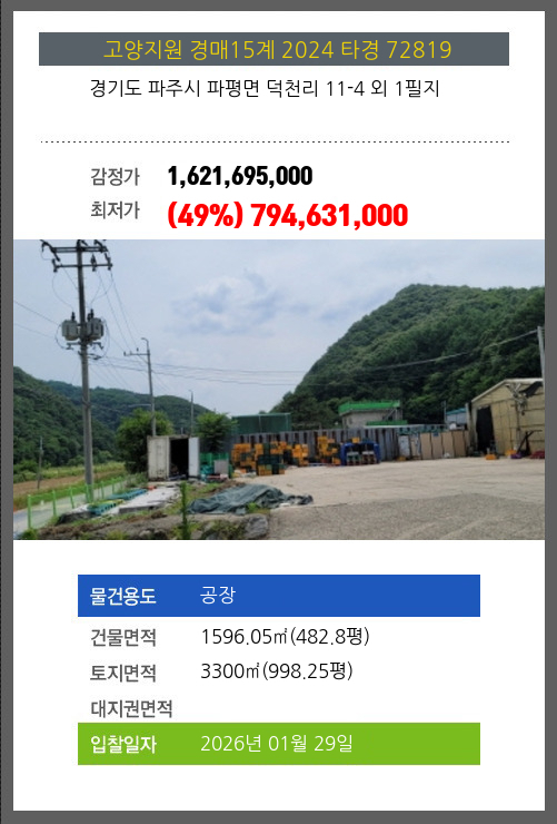 사건번호 2024 타경 72819 본건은 경기도 파주시 파평면 덕천리 11-4 외 1필지소재하는 공장경매 물건의 포스팅입니다. 건물면적 [ 1596.05㎡ (482.8평) ]토지면적 [ 3300㎡ (998.25평) ] 시세를