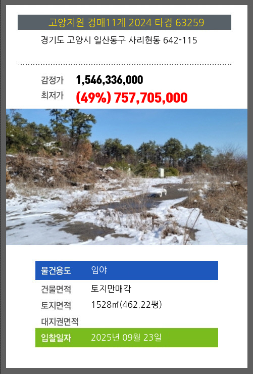사건번호 2024 타경 63259 본건은 경기도 고양시 일산동구 사리현동 642-115소재하는 임야경매 물건의 포스팅입니다. 건물면적 [ 토지만매각 ]토지면적 [ 1528㎡ (462.22평) ] 시세를 반영한 감정가 1,546,336,000에서2회