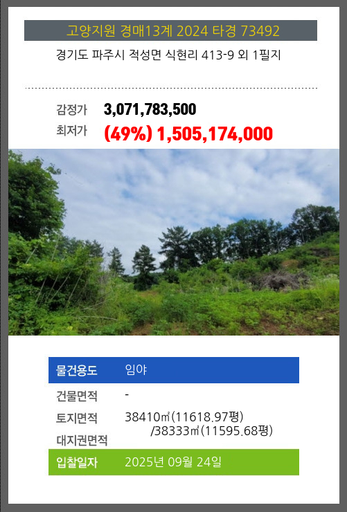 사건번호 2024 타경 73492 본건은 경기도 파주시 적성면 식현리 413-9 외 1필지소재하는 임야경매 물건의 포스팅입니다. 토지면적 [ 전체:38410㎡ (11618.97평) 매각지분:38333㎡ (11595.68평) ] 시세를 반영한 감정가