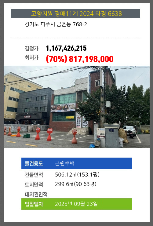 사건번호 2024 타경 6638 본건은 경기도 파주시 금촌동 768-2소재하는 근린주택경매 물건의 포스팅입니다. 건물면적 [ 506.12㎡ (153.1평) ]토지면적 [ 299.6㎡ (90.63평) ] 시세를 반영한 감정가 1,167,426,215에서1회