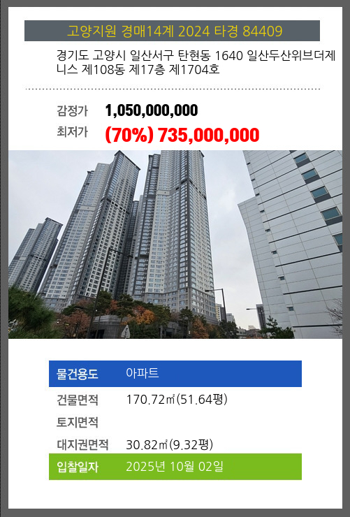 사건번호 2024 타경 84409 본건은 경기도 고양시 일산서구 탄현동 1640 일산두산위브더제니스 제108동 제17층 제1704호소재하는 아파트경매 물건의 포스팅입니다. 건물면적 [ 170.72㎡ (51.64평) ]대지권 [ 30.82㎡ (9.32평)