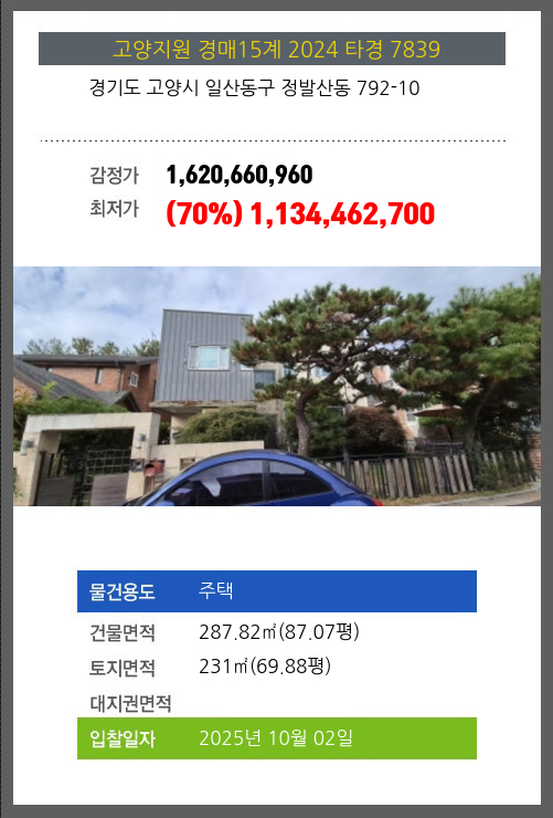 사건번호 2024 타경 7839 본건은 경기도 고양시 일산동구 정발산동 792-10소재하는 주택경매 물건의 포스팅입니다. 건물면적 [ 287.82㎡ (87.07평) ]토지면적 [ 231㎡ (69.88평) ] 시세를 반영한 감정가