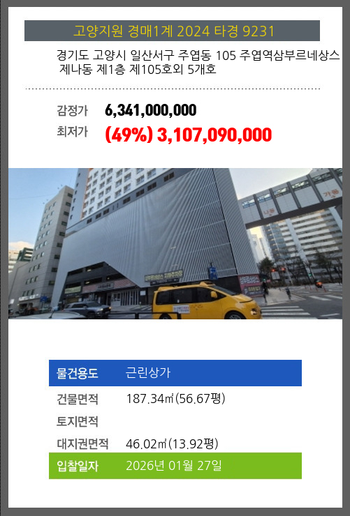 사건번호 2024 타경 9231 본건은 경기도 고양시 일산서구 주엽동 105 주엽역삼부르네상스 제나동 제1층 제105호외 5개호소재하는 근린상가경매 물건의 포스팅입니다. 건물면적 [ 187.34㎡ (56.67평) ]대지권 [ 46.02㎡