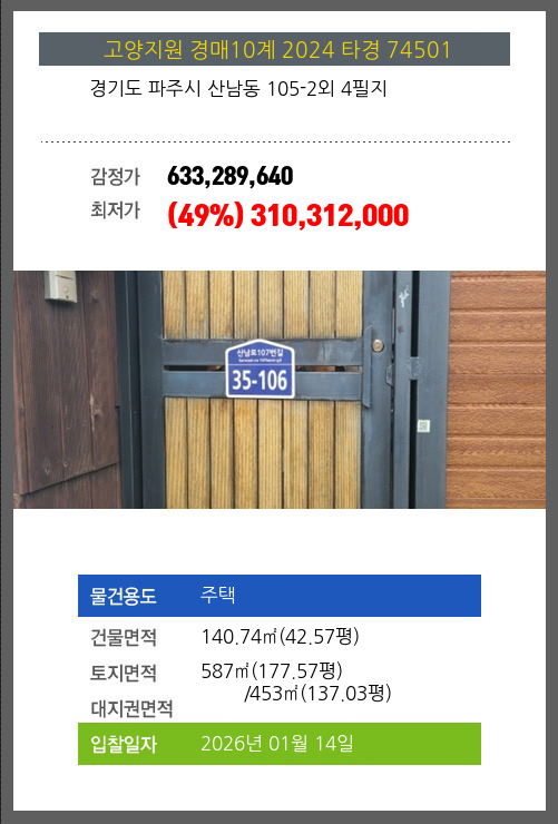 사건번호 2024 타경 74501 본건은 경기도 파주시 산남동 105-2외 4필지소재하는 주택경매 물건의 포스팅입니다. 건물면적 [ 140.74㎡ (42.57평) ]토지면적 [ 전체:587㎡ (177.57평) 매각지분:453㎡ (137.03평) ] 시세를