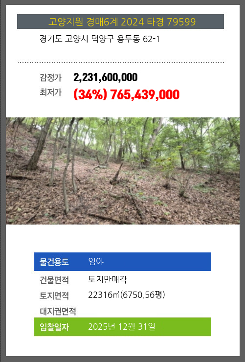 사건번호 2024 타경 79599 본건은 경기도 고양시 덕양구 용두동 62-1소재하는 임야경매 물건의 포스팅입니다. 건물면적 [ 토지만매각 ]토지면적 [ 22316㎡ (6750.56평) ] 시세를 반영한 감정가 2,231,600,000에서3회