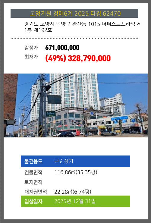 사건번호 2025 타경 62470 본건은 경기도 고양시 덕양구 관산동 1015 더퍼스트프라임 제1층 제192호소재하는 근린상가경매 물건의 포스팅입니다. 건물면적 [ 116.86㎡ (35.35평) ]대지권 [ 22.28㎡ (6.74평) ]