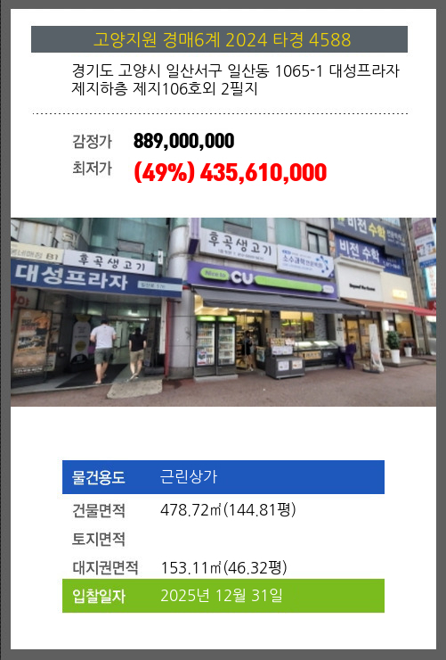 사건번호 2024 타경 4588 본건은 경기도 고양시 일산서구 일산동 1065-1 대성프라자 제지하층 제지106호외 2필지소재하는 근린상가경매 물건의 포스팅입니다. 건물면적 [ 478.72㎡ (144.81평) ]대지권 [ 153.11㎡ (46.32평)