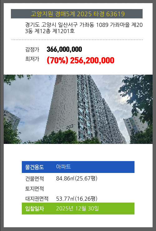 사건번호 2025 타경 63619 본건은 경기도 고양시 일산서구 가좌동 1089 가좌마을 제203동 제12층 제1201호소재하는 아파트경매 물건의 포스팅입니다. 건물면적 [ 84.86㎡ (25.67평) ]대지권 [ 53.77㎡ (16.26평)