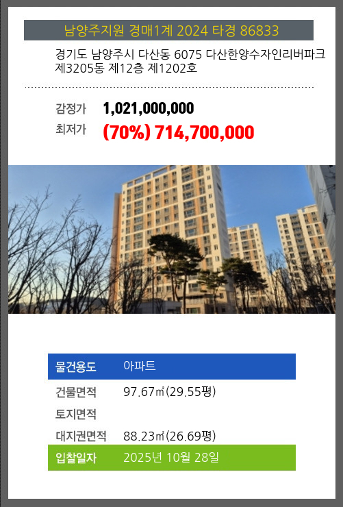사건번호 2024 타경 86833 본건은 경기도 남양주시 다산동 6075 다산한양수자인리버파크 제3205동 제12층 제1202호소재하는 아파트경매 물건의 포스팅입니다. 건물면적 [ 97.67㎡ (29.55평) ]대지권 [ 88.23㎡ (26.69평) ]