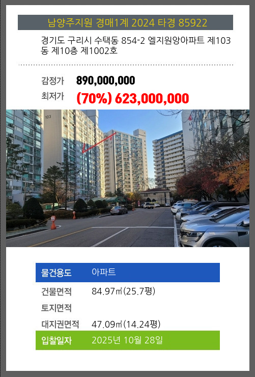 사건번호 2024 타경 85922 본건은 경기도 구리시 수택동 854-2 엘지원앙아파트 제103동 제10층 제1002호소재하는 아파트경매 물건의 포스팅입니다. 건물면적 [ 84.97㎡ (25.7평) ]대지권 [ 47.09㎡ (14.24평) ]