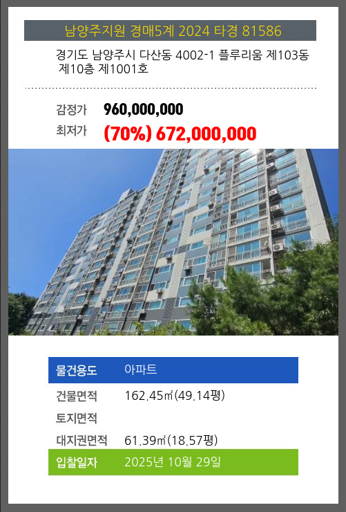 사건번호 2024 타경 81586 본건은 경기도 남양주시 다산동 4002-1 플루리움 제103동 제10층 제1001호소재하는 아파트경매 물건의 포스팅입니다. 건물면적 [ 162.45㎡ (49.14평) ]대지권 [ 61.39㎡ (18.57평) ]