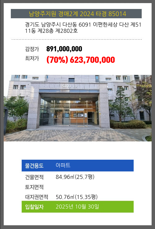 사건번호 2024 타경 85014 본건은 경기도 남양주시 다산동 6091 이편한세상 다산 제5111동 제28층 제2802호소재하는 아파트경매 물건의 포스팅입니다. 건물면적 [ 84.96㎡ (25.7평) ]대지권 [ 50.76㎡ (15.35평)