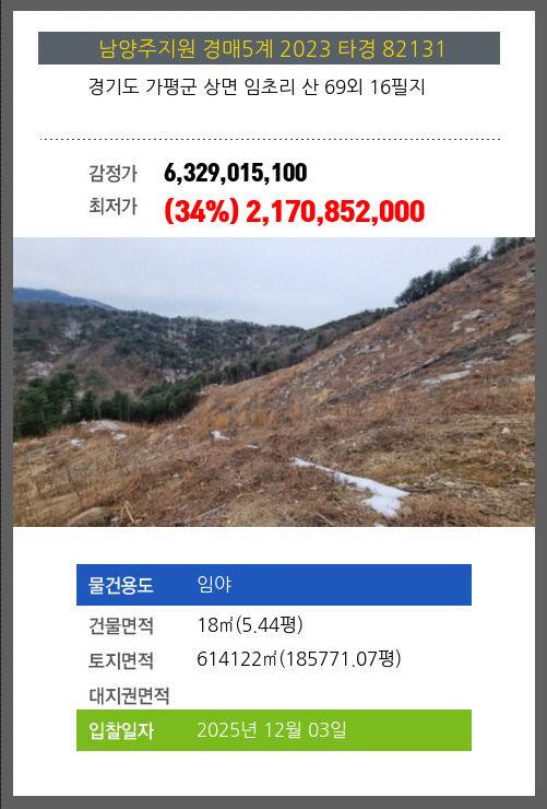 사건번호 2023 타경 82131 본건은 경기도 가평군 상면 임초리 산 69외 16필지소재하는 임야경매 물건의 포스팅입니다. 건물면적 [ 18㎡ (5.44평) ]토지면적 [ 614122㎡ (185771.07평) ] 시세를