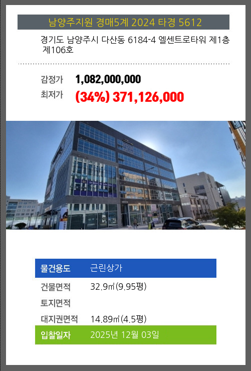 사건번호 2024 타경 5612 본건은 경기도 남양주시 다산동 6184-4 엘센트로타워 제1층 제106호소재하는 근린상가경매 물건의 포스팅입니다. 건물면적 [ 32.9㎡ (9.95평) ]대지권 [ 14.89㎡ (4.5평) ] 시세를