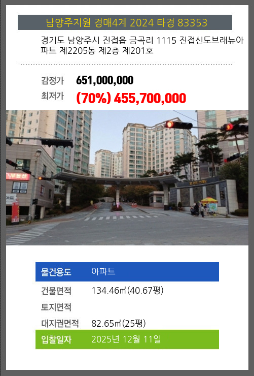 사건번호 2024 타경 83353 본건은 경기도 남양주시 진접읍 금곡리 1115 진접신도브래뉴아파트 제2205동 제2층 제201호소재하는 아파트경매 물건의 포스팅입니다. 건물면적 [ 134.46㎡ (40.67평) ]대지권 [ 82.65㎡ (25평)