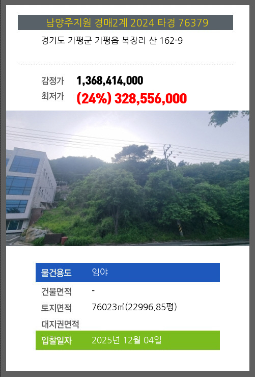 사건번호 2024 타경 76379 본건은 경기도 가평군 가평읍 복장리 산 162-9소재하는 임야경매 물건의 포스팅입니다. 토지면적 [ 76023㎡ (22996.85평) ] 시세를 반영한 감정가 1,368,414,000에서4회 유찰되어 감정가