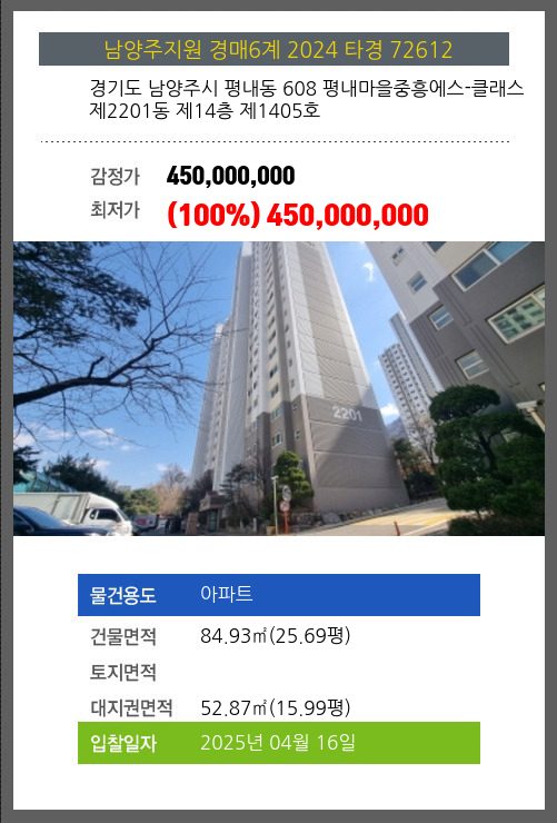 사건번호 2024 타경 72612 본건은 경기도 남양주시 평내동 608 평내마을중흥에스-클래스 제2201동 제14층 제1405호소재하는 아파트경매 물건의 포스팅입니다. 건물면적 [ 84.93㎡ (25.69평) ]대지권 [ 52.87㎡ (15.99평) ]