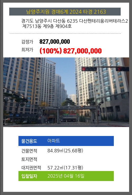 사건번호 2024 타경 2163 본건은 경기도 남양주시 다산동 6235 다산펜테리움리버테라스2 제7513동 제9층 제904호소재하는 아파트경매 물건의 포스팅입니다. 건물면적 [ 84.89㎡ (25.68평) ]대지권 [ 57.22㎡ (17.31평) ]