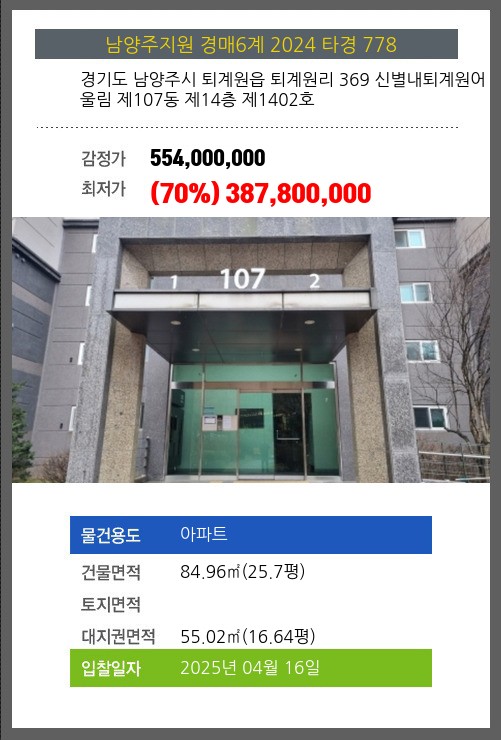 사건번호 2024 타경 778 본건은 경기도 남양주시 퇴계원읍 퇴계원리 369 신별내퇴계원어울림 제107동 제14층 제1402호소재하는 아파트경매 물건의 포스팅입니다. 건물면적 [ 84.96㎡ (25.7평) ]대지권 [ 55.02㎡ (16.64평)