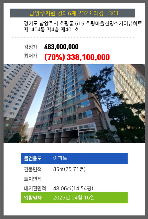 사건번호 2023 타경 5301 본건은 경기도 남양주시 호평동 615 호평마을신명스카이뷰하트 제1404동 제4층 제401호소재하는 아파트경매 물건의 포스팅입니다. 건물면적 [ 85㎡ (25.71평) ]대지권 [ 48.06㎡ (14.54평) ]