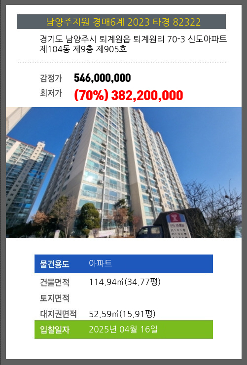 사건번호 2023 타경 82322 본건은 경기도 남양주시 퇴계원읍 퇴계원리 70-3 신도아파트 제104동 제9층 제905호소재하는 아파트경매 물건의 포스팅입니다. 건물면적 [ 114.94㎡ (34.77평) ]대지권 [ 52.59㎡ (15.91평)