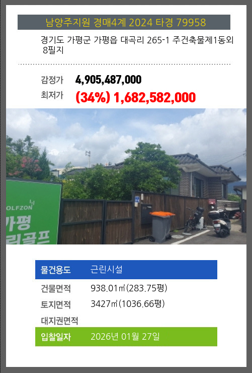 사건번호 2024 타경 79958 본건은 경기도 가평군 가평읍 대곡리 265-1 주건축물제1동외 8필지소재하는 근린시설경매 물건의 포스팅입니다. 건물면적 [ 938.01㎡ (283.75평) ]토지면적 [ 3427㎡ (1036.66평) ] 시세를