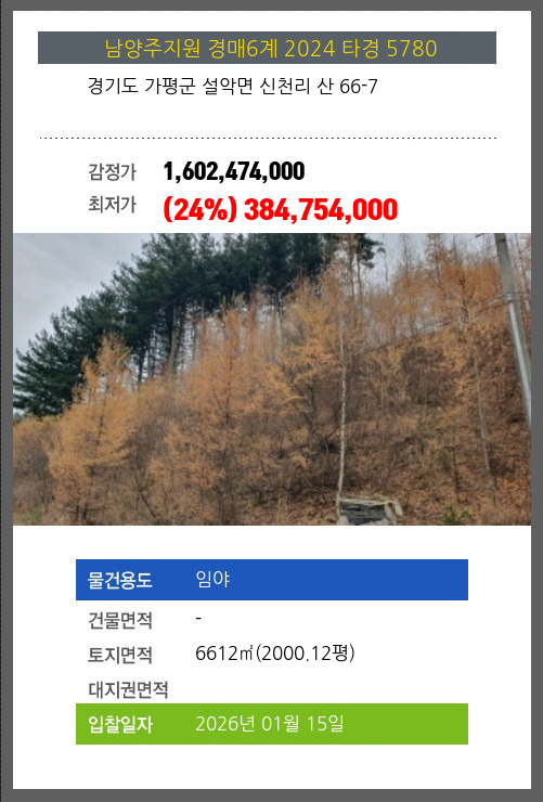 사건번호 2024 타경 5780 본건은 경기도 가평군 설악면 신천리 산 66-7소재하는 임야경매 물건의 포스팅입니다. 토지면적 [ 6612㎡ (2000.12평) ] 시세를 반영한 감정가 1,602,474,000에서4회 유찰되어 감정가