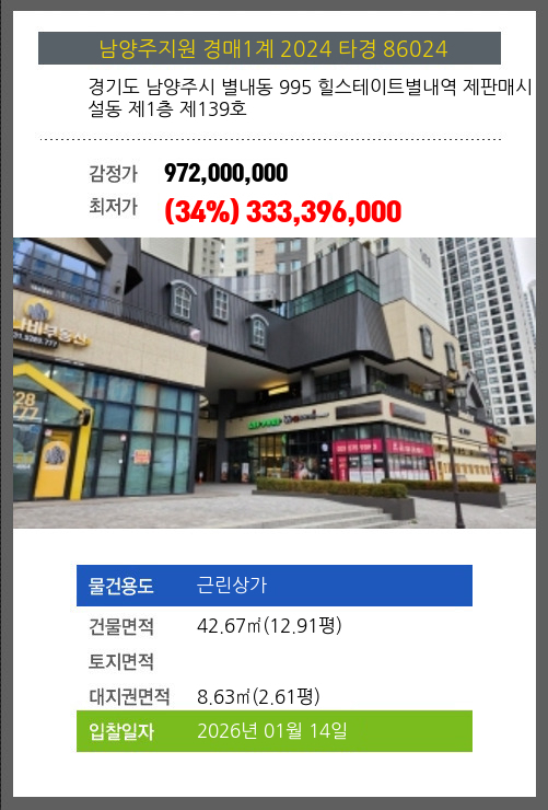 사건번호 2024 타경 86024 본건은 경기도 남양주시 별내동 995 힐스테이트별내역 제판매시설동 제1층 제139호소재하는 근린상가경매 물건의 포스팅입니다. 건물면적 [ 42.67㎡ (12.91평) ]대지권 [ 8.63㎡ (2.61평) ]