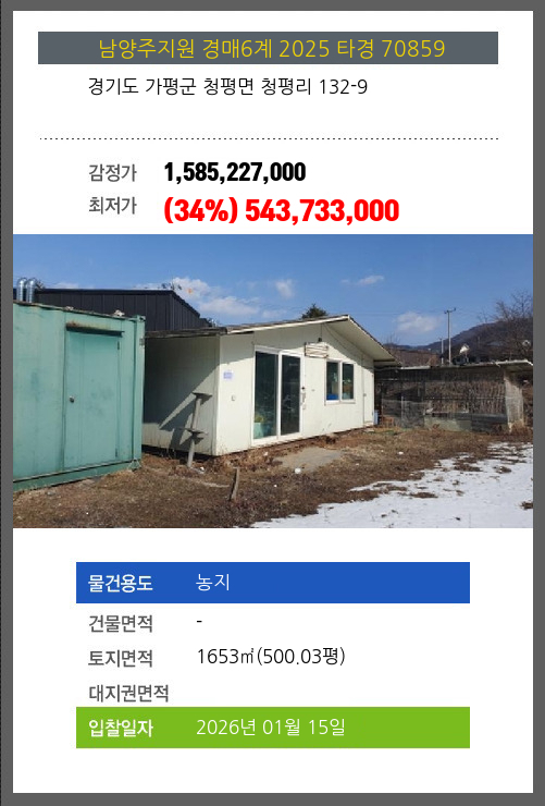 사건번호 2025 타경 70859 본건은 경기도 가평군 청평면 청평리 132-9소재하는 농지경매 물건의 포스팅입니다. 토지면적 [ 1653㎡ (500.03평) ] 시세를 반영한 감정가 1,585,227,000에서3회 유찰되어 감정가 대비