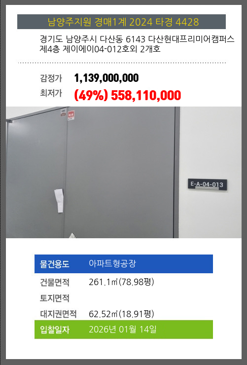 사건번호 2024 타경 4428 본건은 경기도 남양주시 다산동 6143 다산현대프리미어캠퍼스 제4층 제이에이04-012호외 2개호소재하는 아파트형공장경매 물건의 포스팅입니다. 건물면적 [ 261.1㎡ (78.98평) ]대지권 [ 62.52㎡ (18.91평) ]