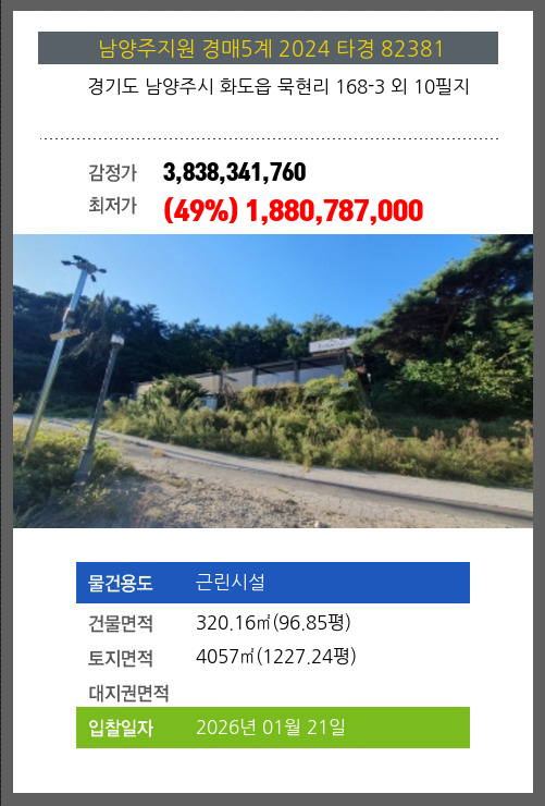 사건번호 2024 타경 82381 본건은 경기도 남양주시 화도읍 묵현리 168-3 외 10필지소재하는 근린시설경매 물건의 포스팅입니다. 건물면적 [ 320.16㎡ (96.85평) ]토지면적 [ 4057㎡ (1227.24평) ] 시세를